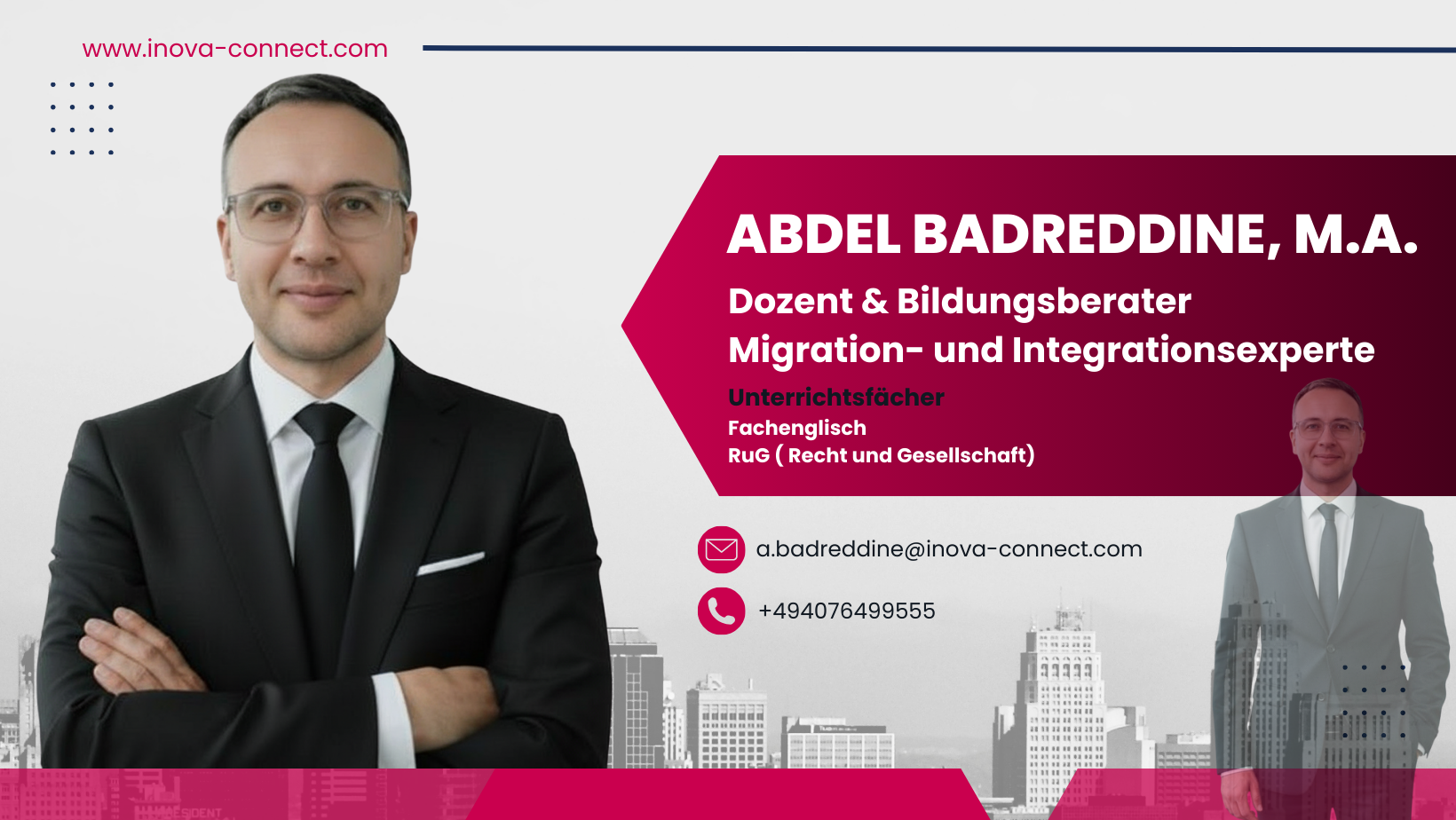 Herr Badreddine ist Geschäftsführer von Inova Connect und ein erfahrener Bildungs- und Integrationsspezialist. Nach dem erfolgreichen Abschluss seines Lehramtsstudiums mit dem zweiten Staatsexamen für Englisch,   Sozialwissenschaften und Erziehungswissenschaft hat er einen Masterabschluss in European Studies an der Universität Hamburg erworben, wobei er sich auf migrationsbezogene Themen in der EU spezialisierte.